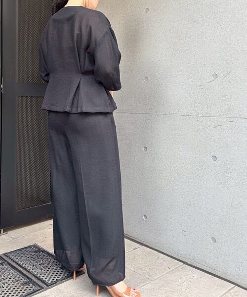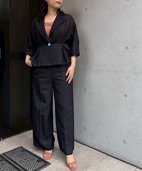 ドロップショルダーからのボリューム袖に、ボディはウエストにタックを寄せたメリハリのあるデザイン。夏の日焼けや冷房対策として、オフィススタイルとしてもおすすめです。