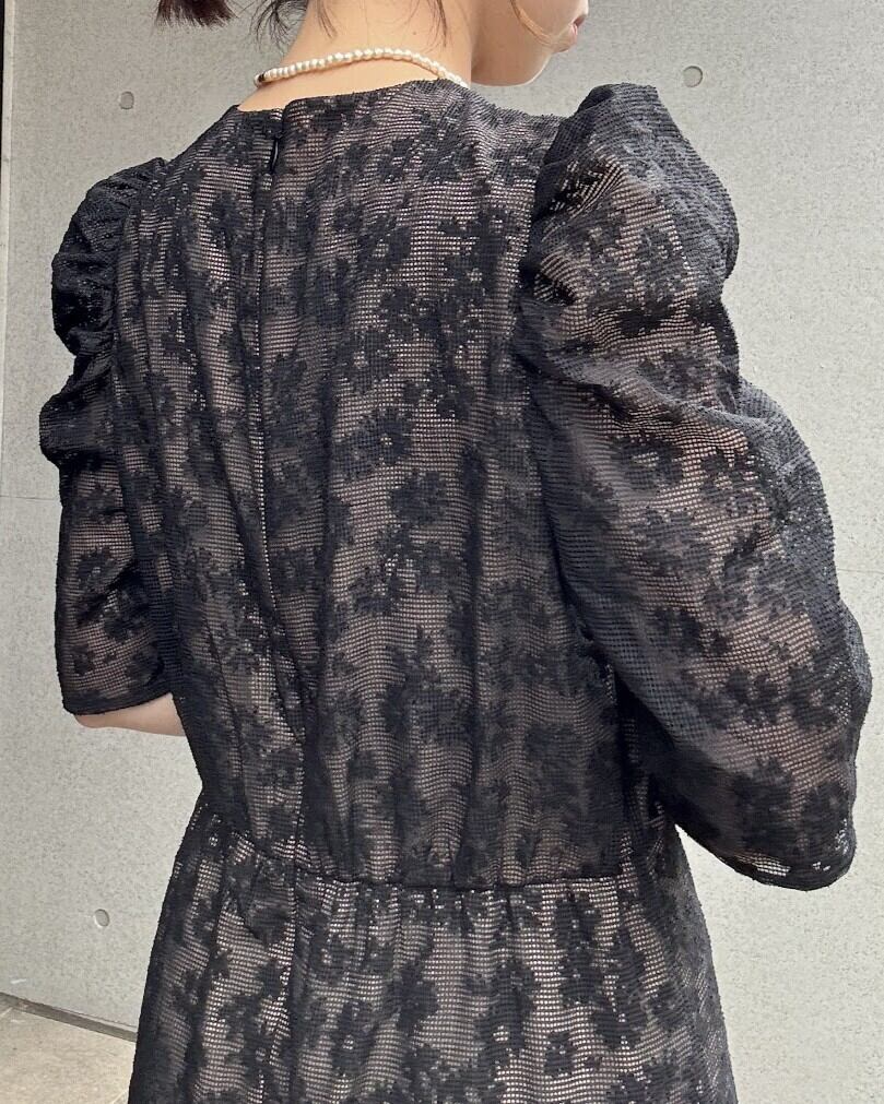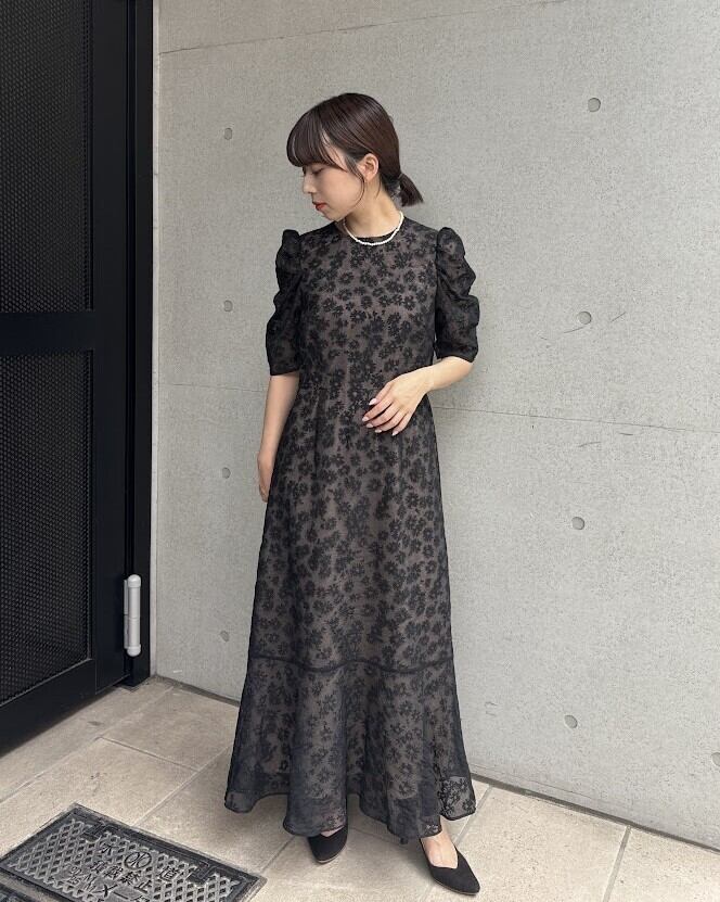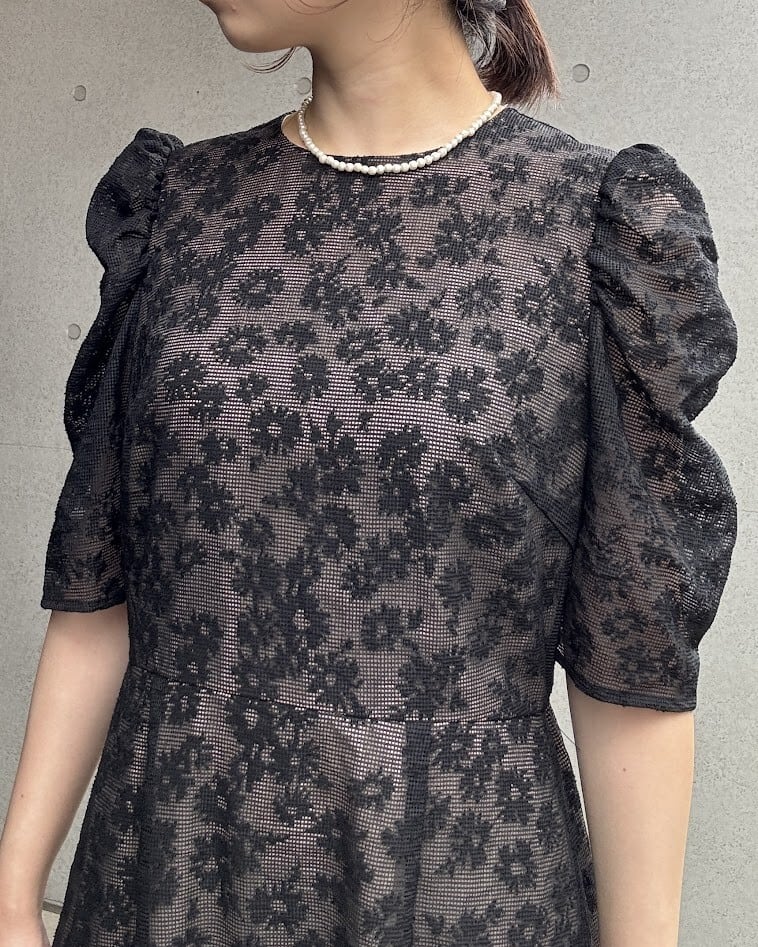 透け感のあるオパールメッシュのフラワー柄が華やかなワンピース。人気のクラシカルなフィットフレアデザイン。裏地との配色カラーがアクセントに。ウエストはバックゴム仕様でストレスフリーに着て頂けます。