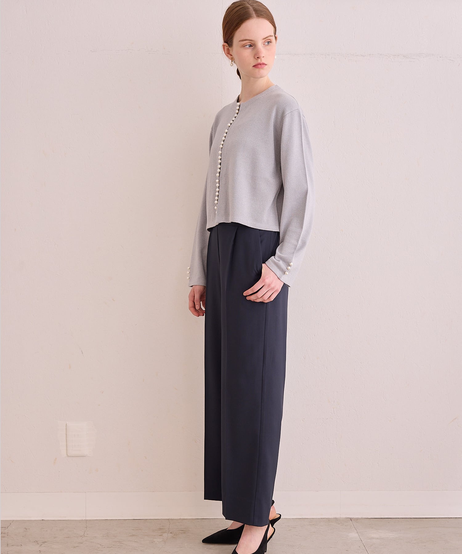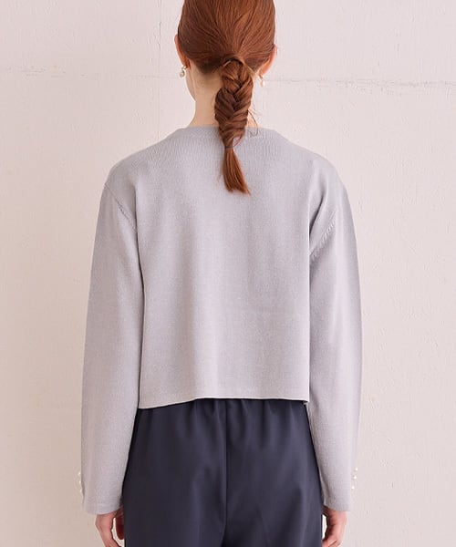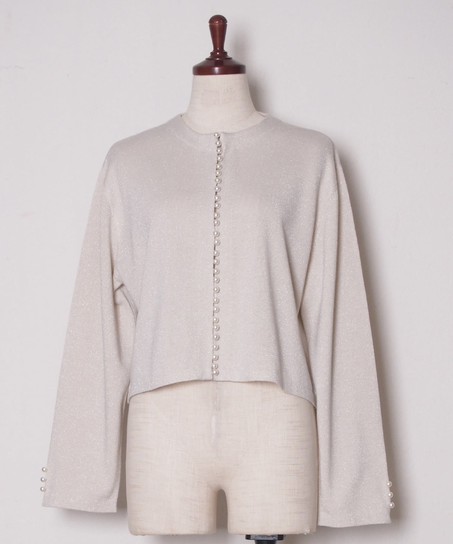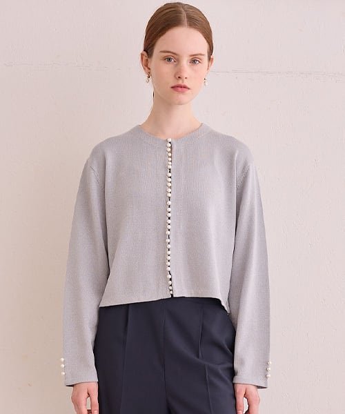 華やかな印象のメタリックジャージ素材のカーディガン。フロントにはパールボタンをあしらいフェミニンな装いに。Tシャツやブラウスの羽織としてフロントオープンにしても、フロントを閉じてデザイントップスとしてのコーディネートも◎。保護者会やママ会など、ママシーンにも活躍できます。