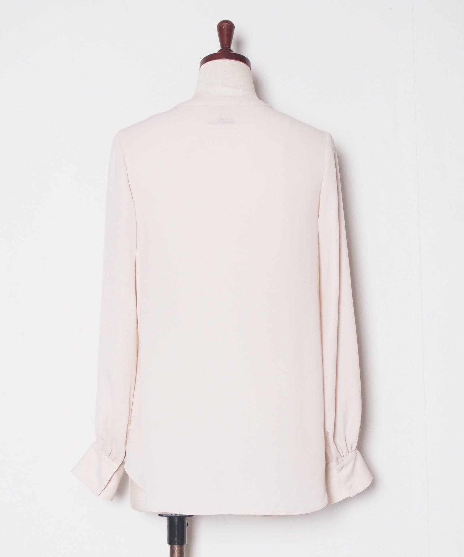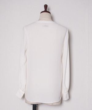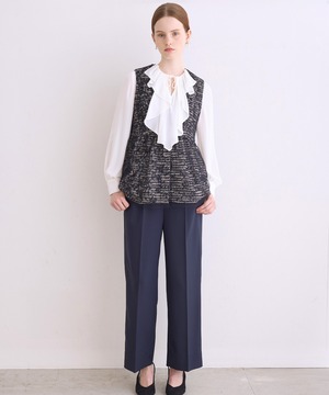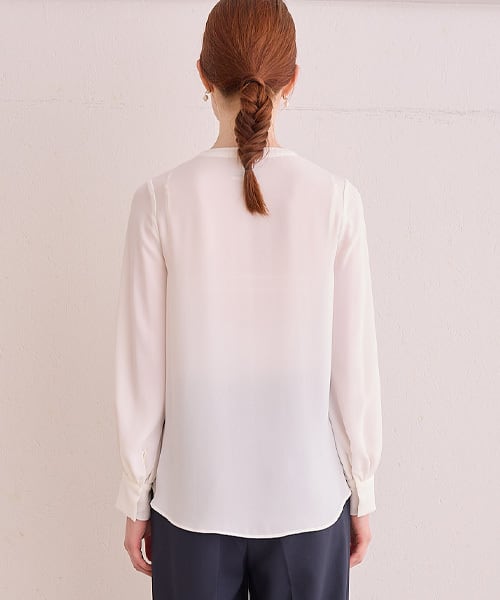 滑らかなシフォン素材で落ち感のあるシルエットを楽しめます。ネックはすっきりとノーカラーデザインに。1枚でもジレやジャケットからフリルをのぞかせるのもおすすめ。