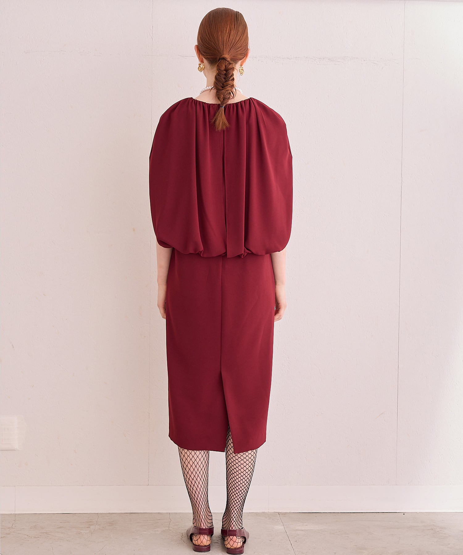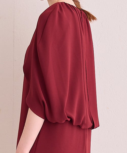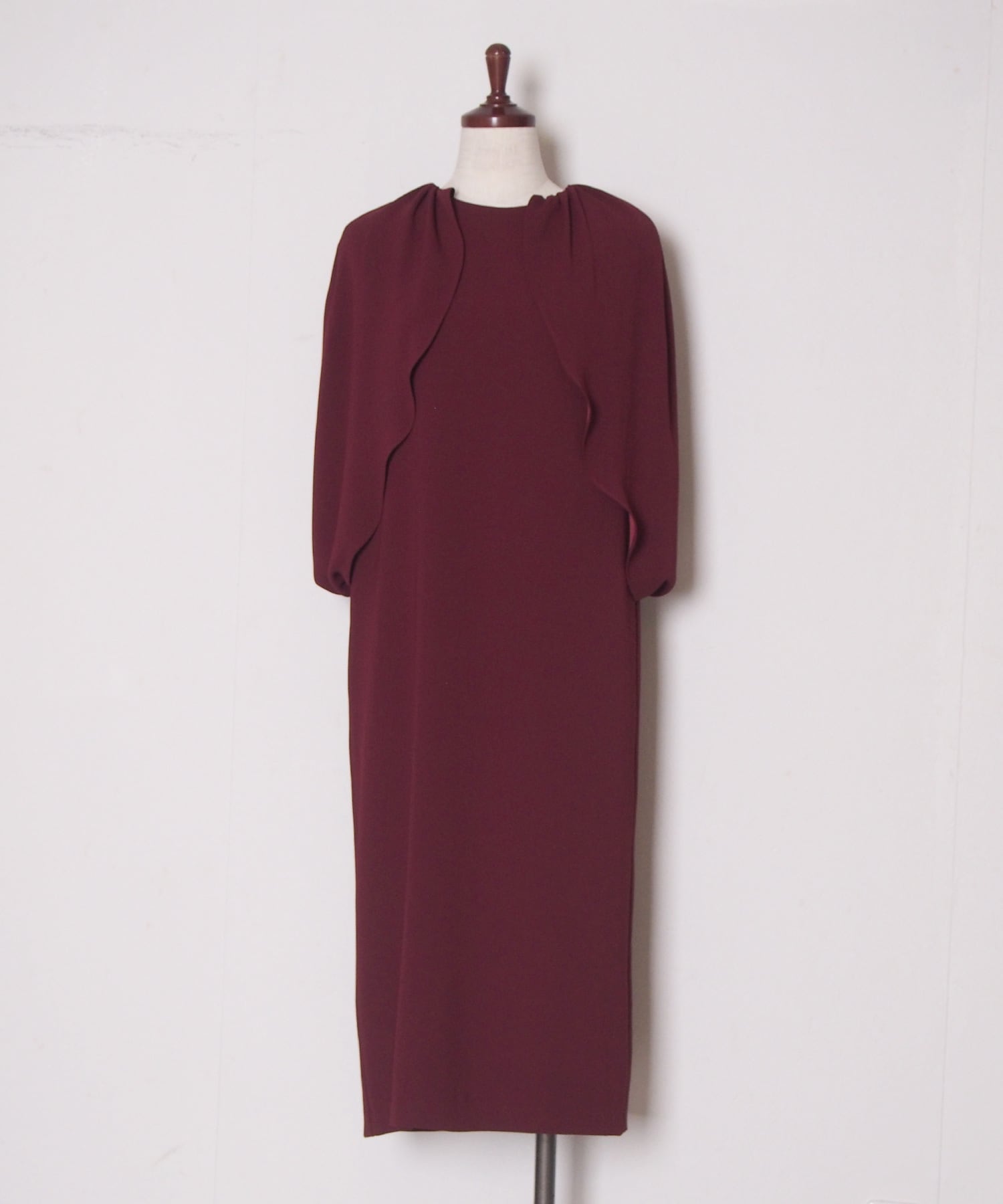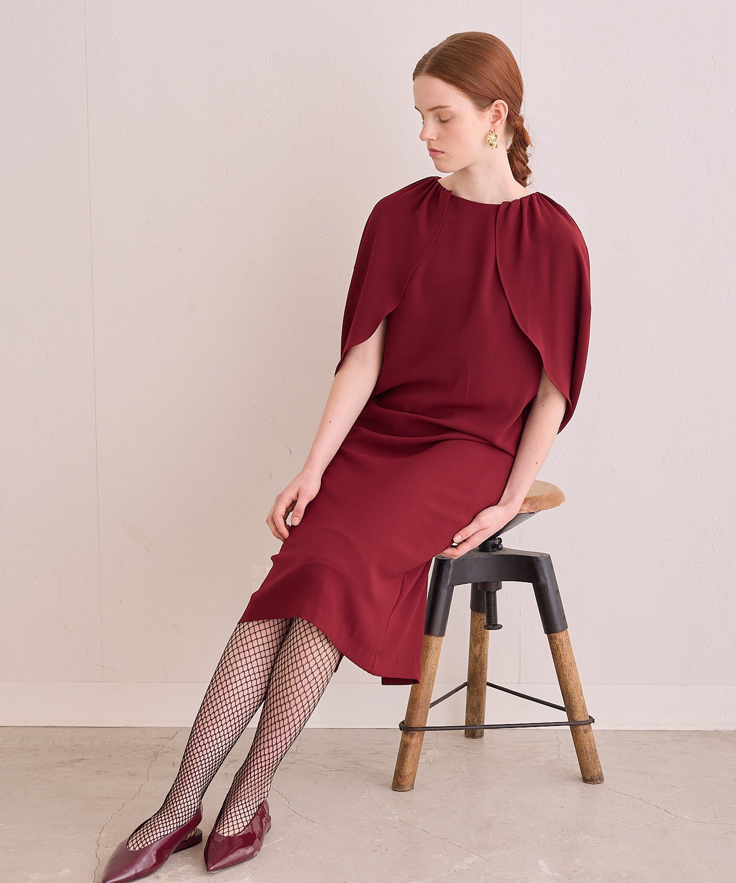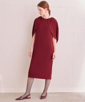 上品なジョーゼット素材にケープデザインが映えるワンピース。すっきりとしたアイラインシルエット。ケープ部分にはギャザーをあしらい立体感のあるフォルムデザインが美しい。