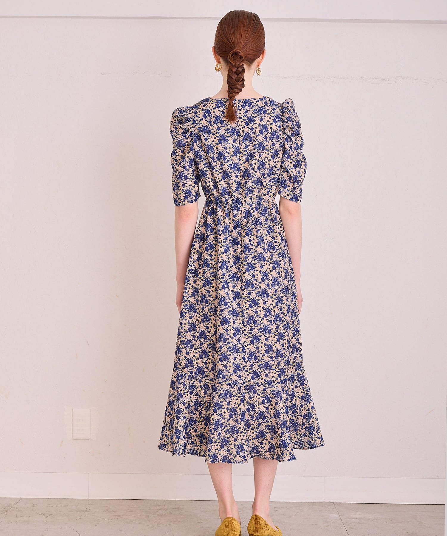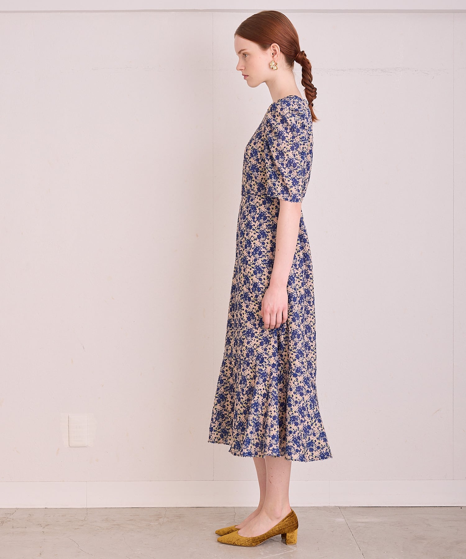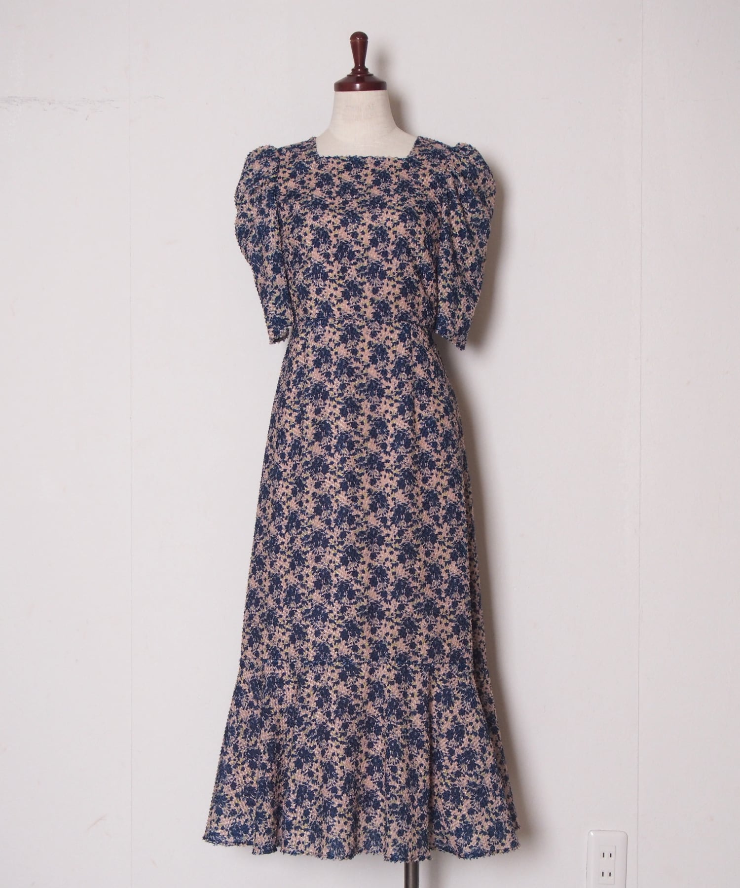 人気のクラシカルなフォルムにオリジナルのフラワープリント生地が映える存在感たっぷりなワンピース。すっきりとしたスクエアネックラインにふんわりとしたパフショルダーがポイント。