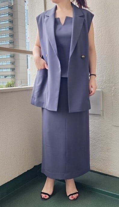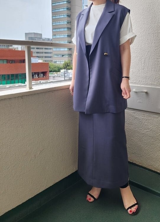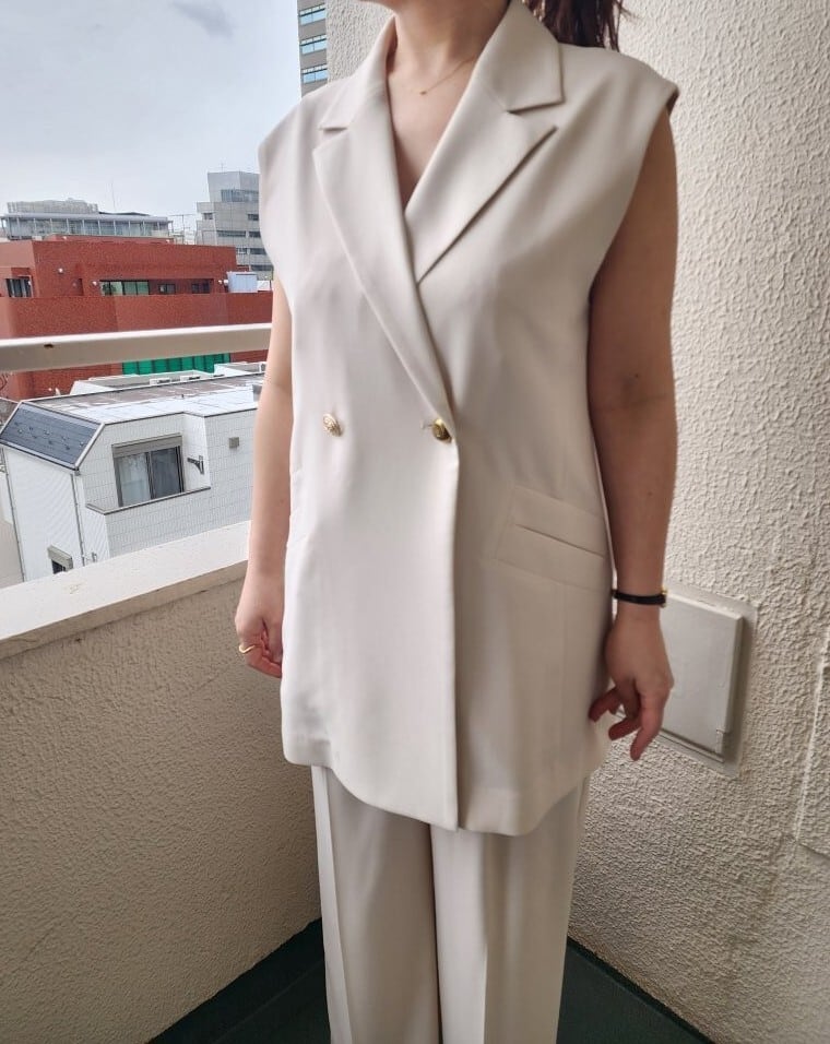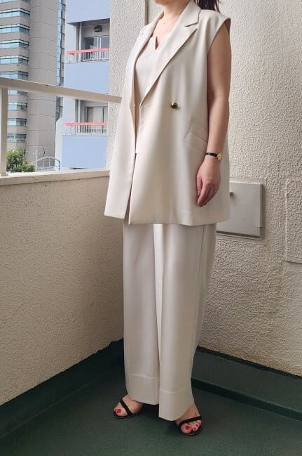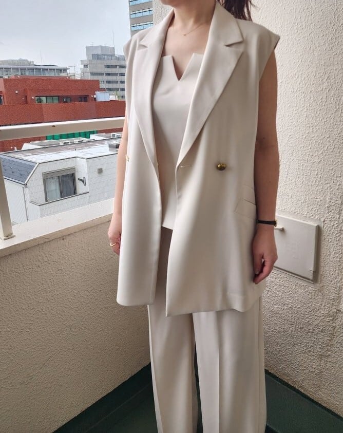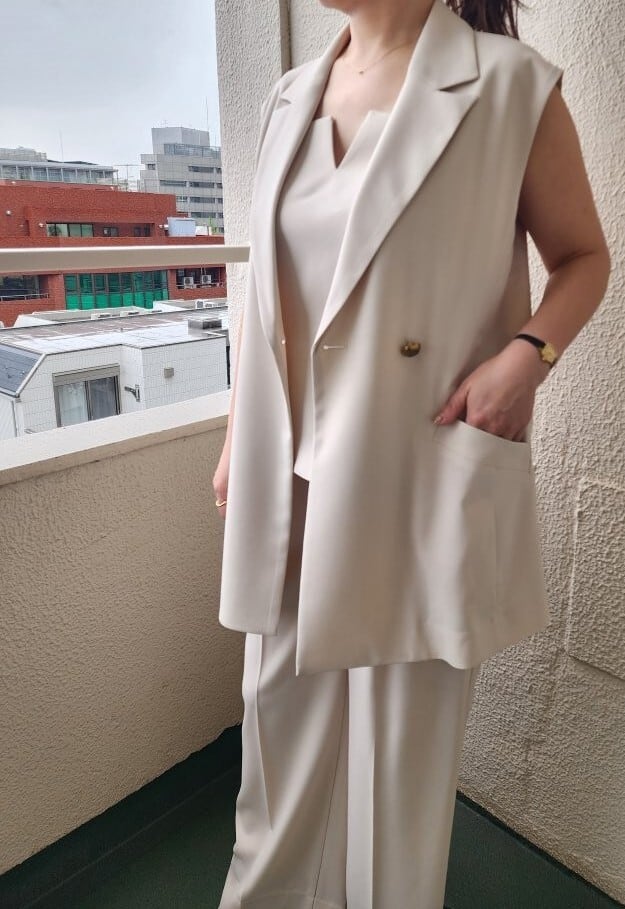 このジレジャケットは、Tシャツやブラウスの上に羽織ることで、クールなスタイルを演出します。同素材のキャミソールやスカート、パンツはもちろん、デニムとの相性も抜群で、カジュアルからフォーマルまで幅広いシーンで重宝します。オフィススタイルに取り入れることで、洗練された印象を与えつつ、休日の外出にも活躍。シンプルなアクセサリーと合わせると、さらに洗練されたスタイルに仕上がります。