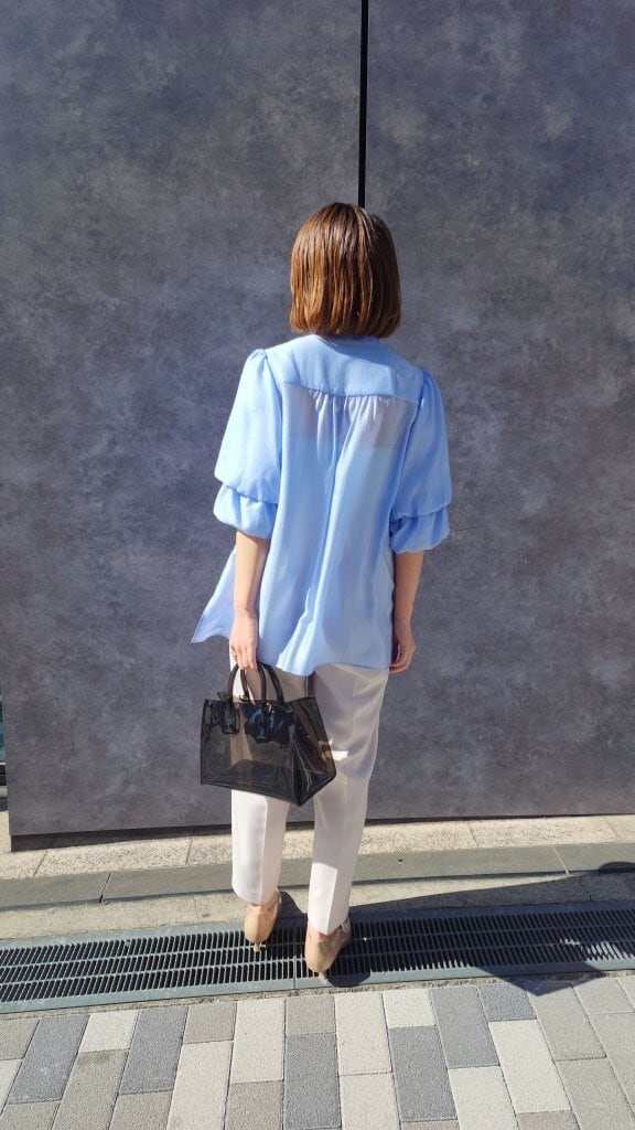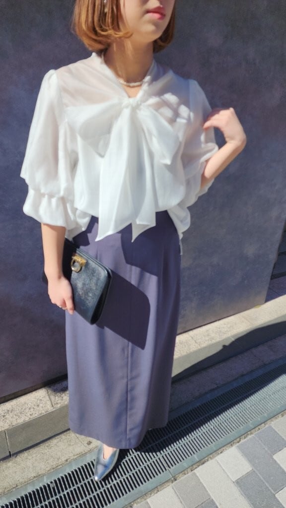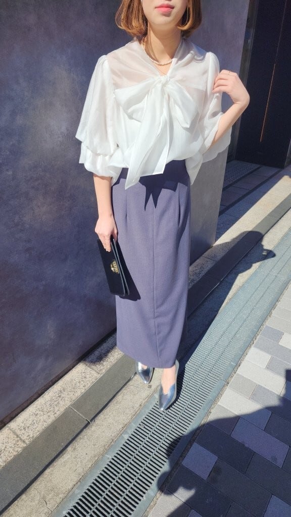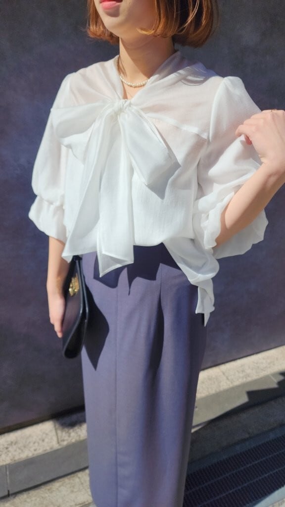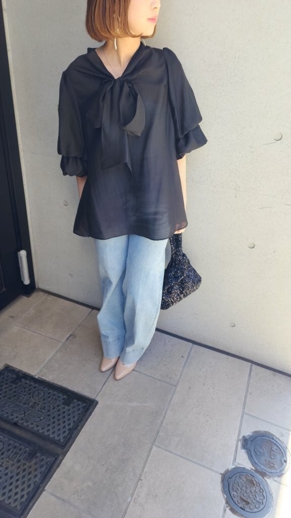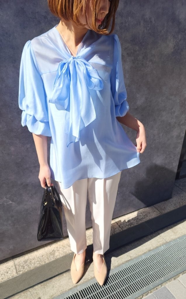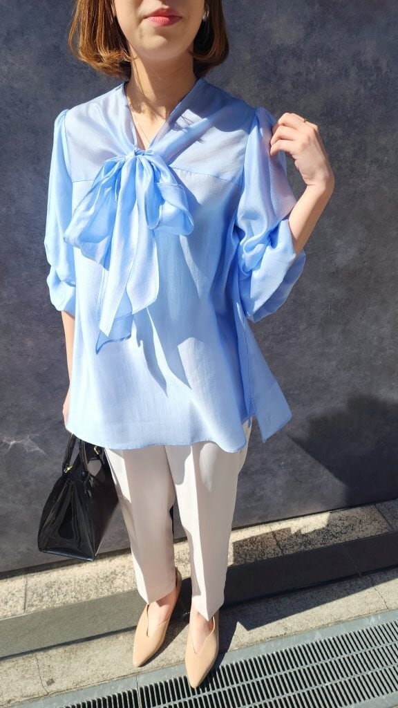 このブラウスは、デニムやスカートとの相性が抜群です。シンプルなボトムスと合わせることで、リボンの存在感を際立たせたスタイルが楽しめます。ジャケットやカーディガンを羽織ると、オフィスシーンでも大活躍です。