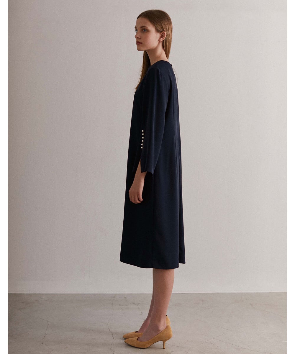 きちんと感のあるダブルクロス生地にシンプルなセミフレアのシルエットでセレモニースタイルにおすすめのデザイン。袖口はスリットにパールボタンのアクセントで華やかな雰囲気をさりげなく。シワになりにくく扱いやすいのも魅力です。卒入園や七五三、保護者会など、ママのオケージョンシーンにおすすめ。