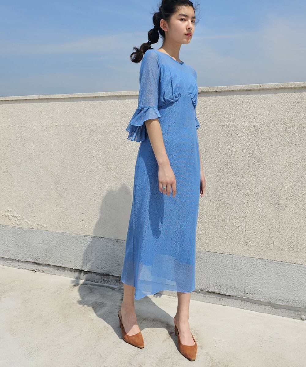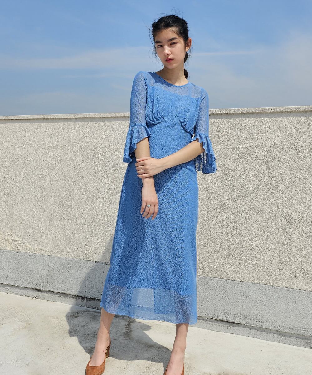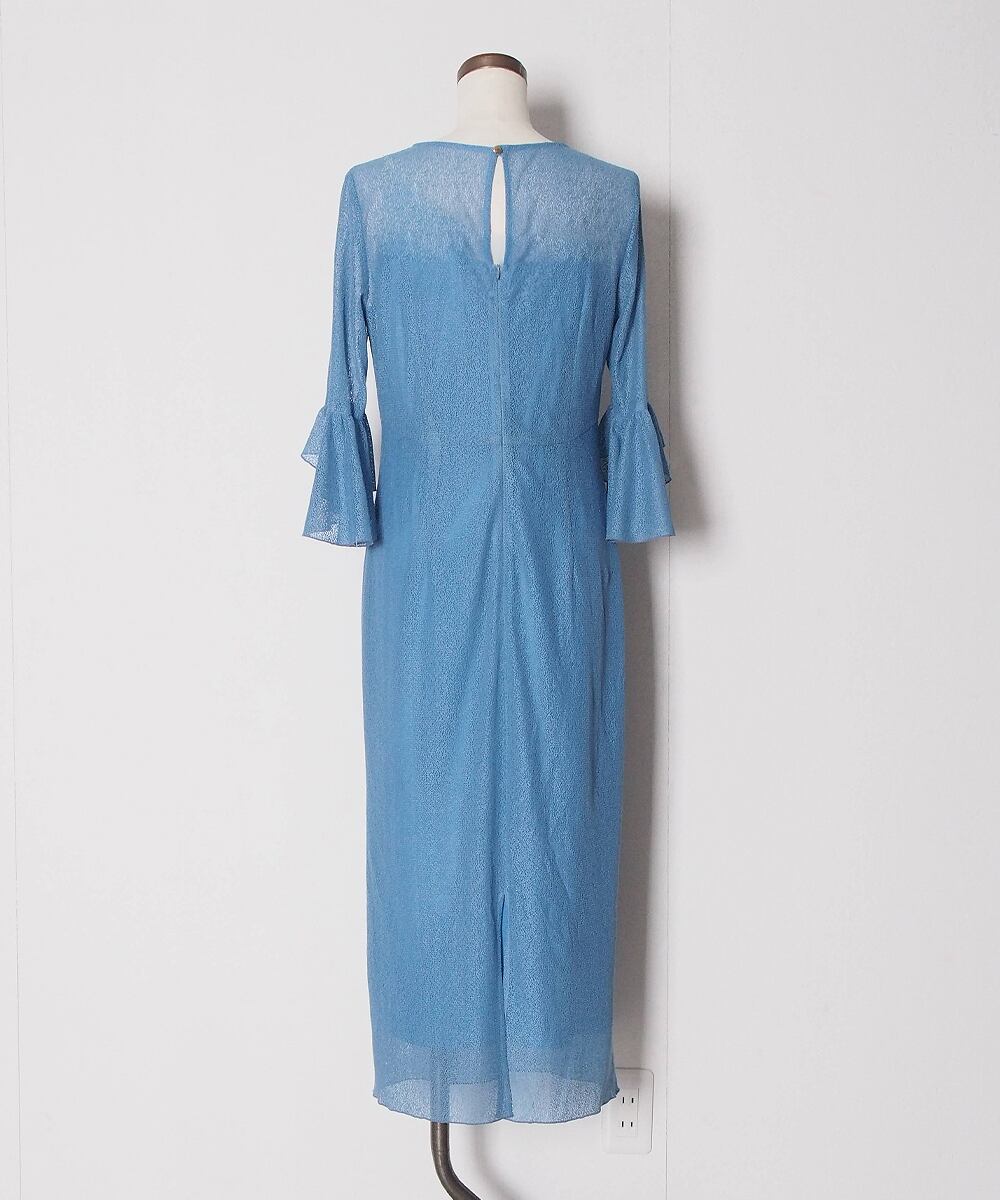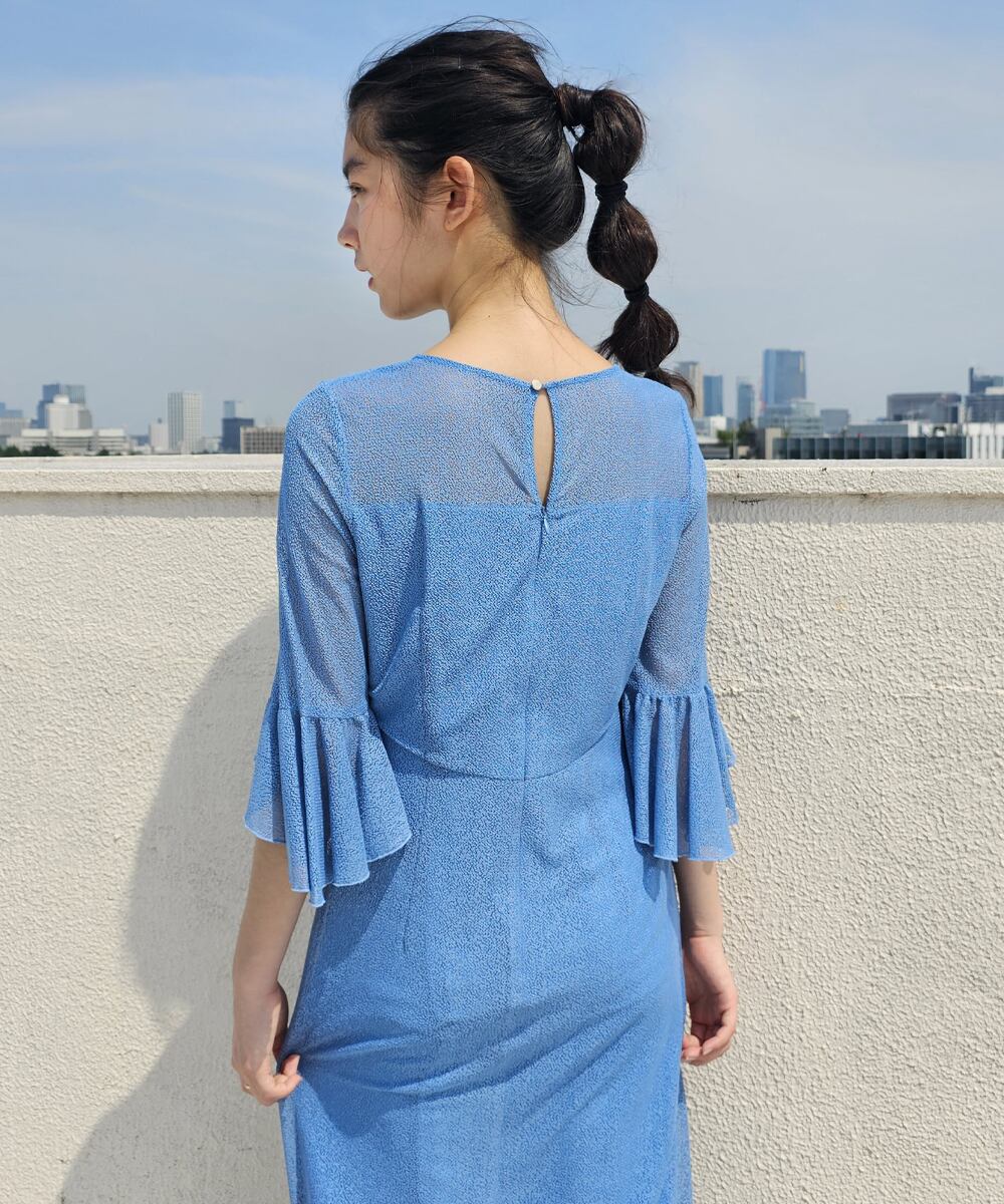 シアー感のあるレース素材に体に沿ったシルエットラインが美しいワンピース。手元を演出するベルスリーブデザインがアクセントポイントに。バストとウエストの切替がさりげなくメリハリを加えています。ジュエリーを重ねて華やかに着こなしたり、ジャケットを羽織ってセレモニースタイルとしても活躍できます。