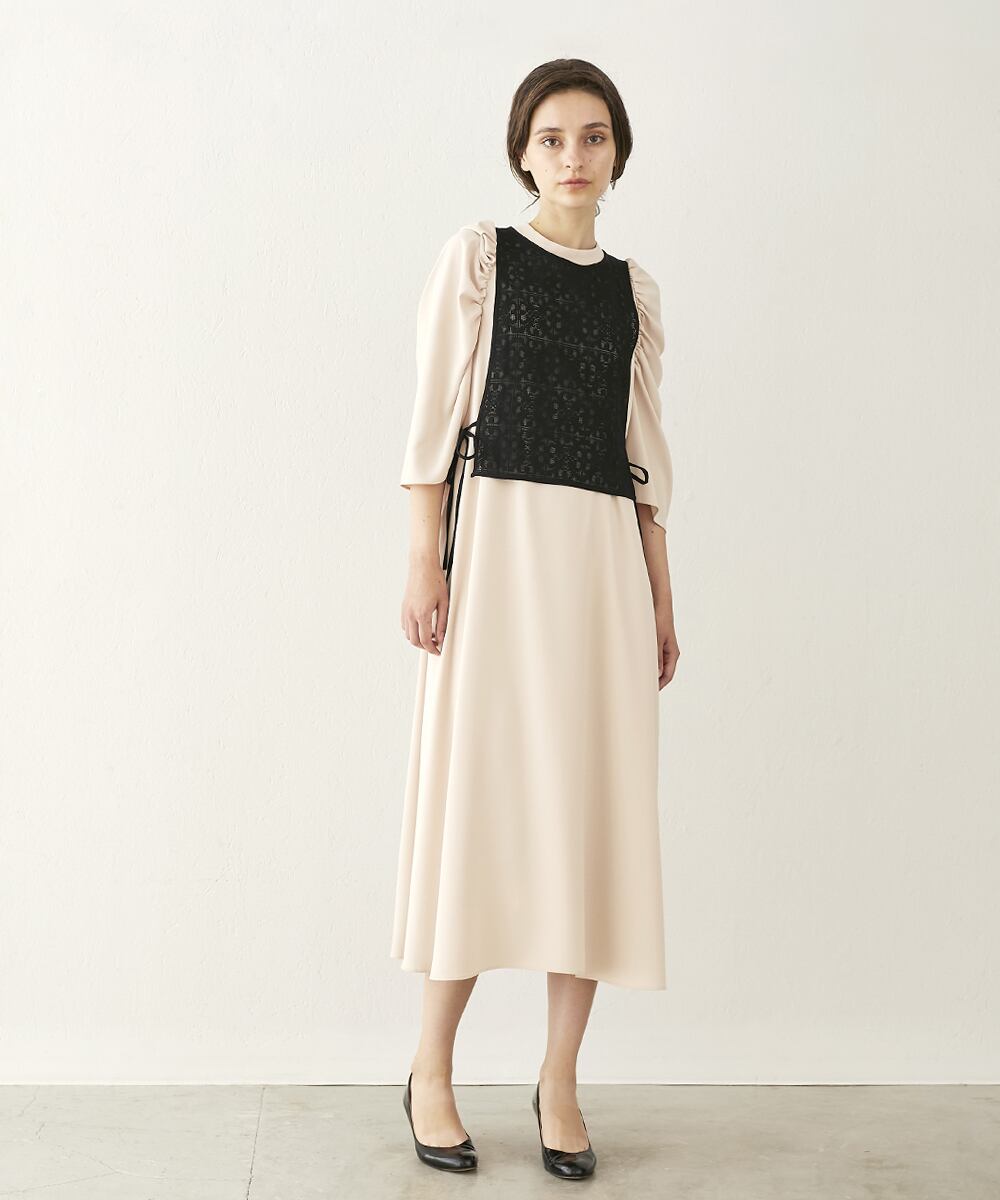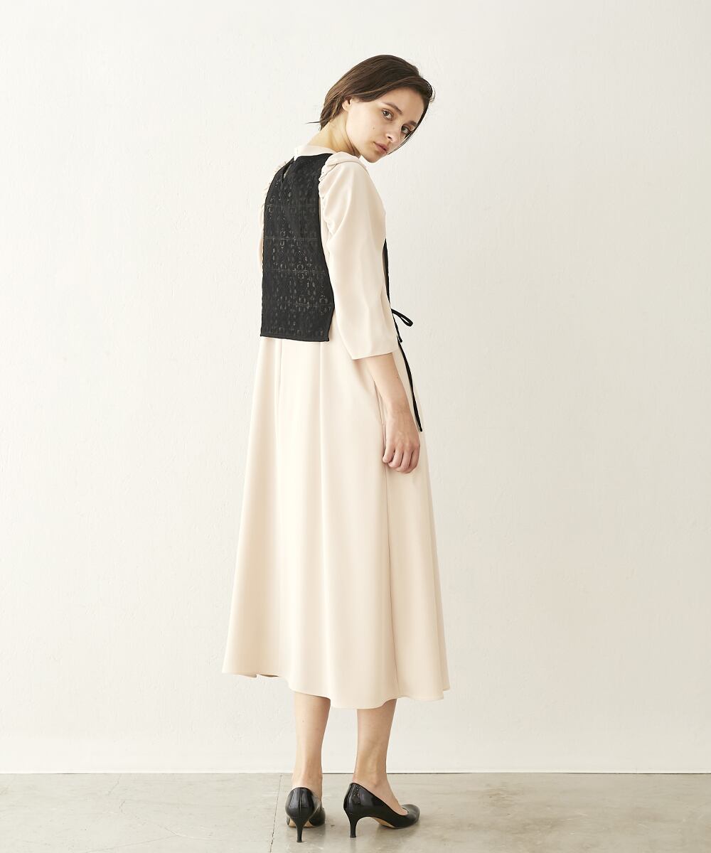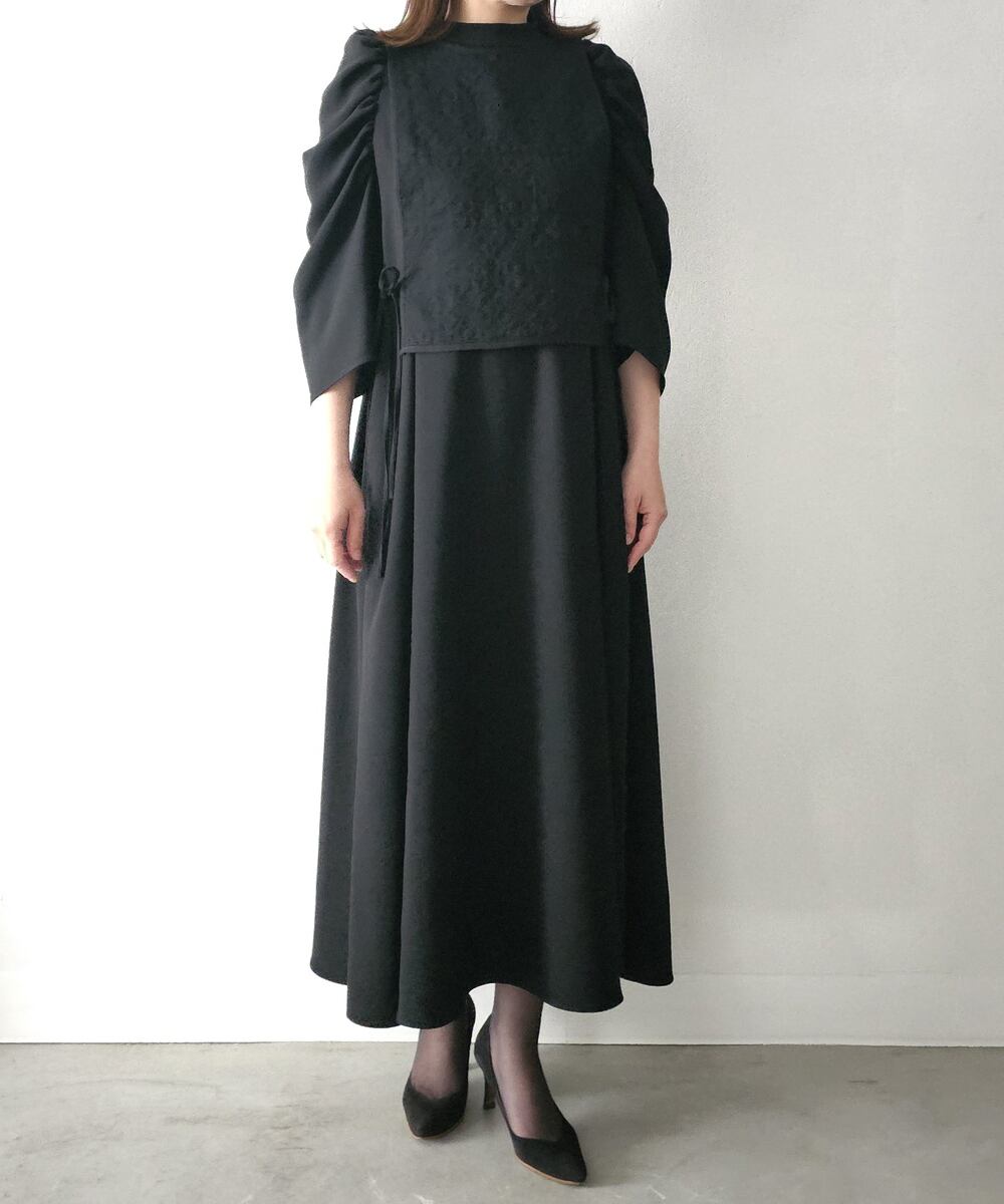 シンプルなシルエットに立体的なショルダーデザインが映えるベスト付きワンピース。エレガントなジョーセット生地は1枚でも華やかな上にプラスアイテム次第で様々なシーンに活躍できるオールラウンダーな一着です。
