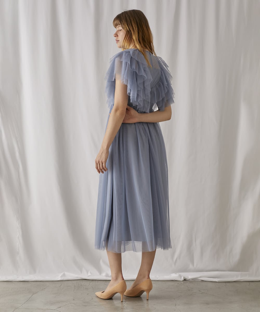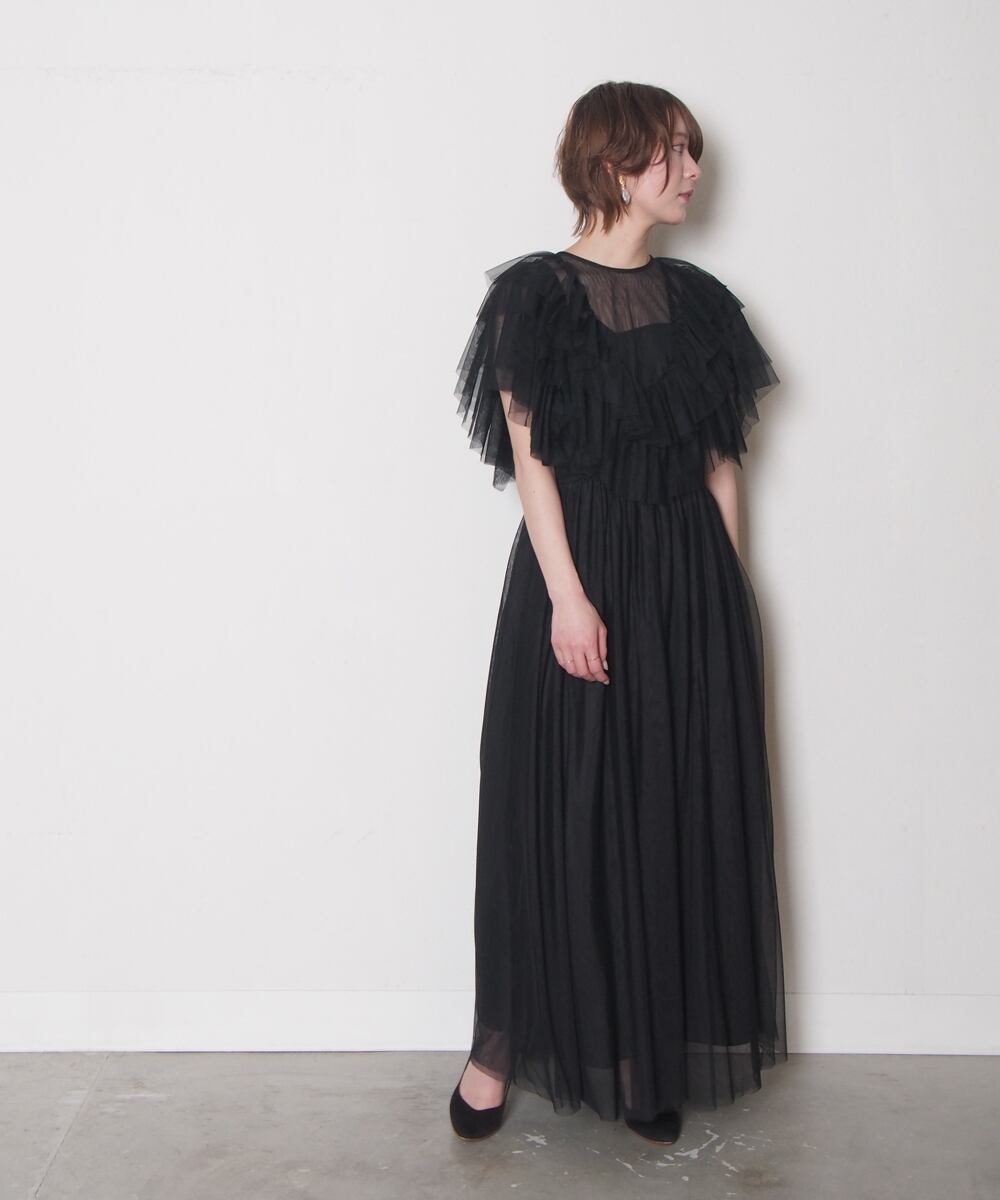 トップスはシアー素材なので適度なボリューム感を楽しめます。スカート部分にもチュールをあしらいフェミニンな雰囲気に。ウエストはゴム仕様で締め付け感なく着て頂けます。